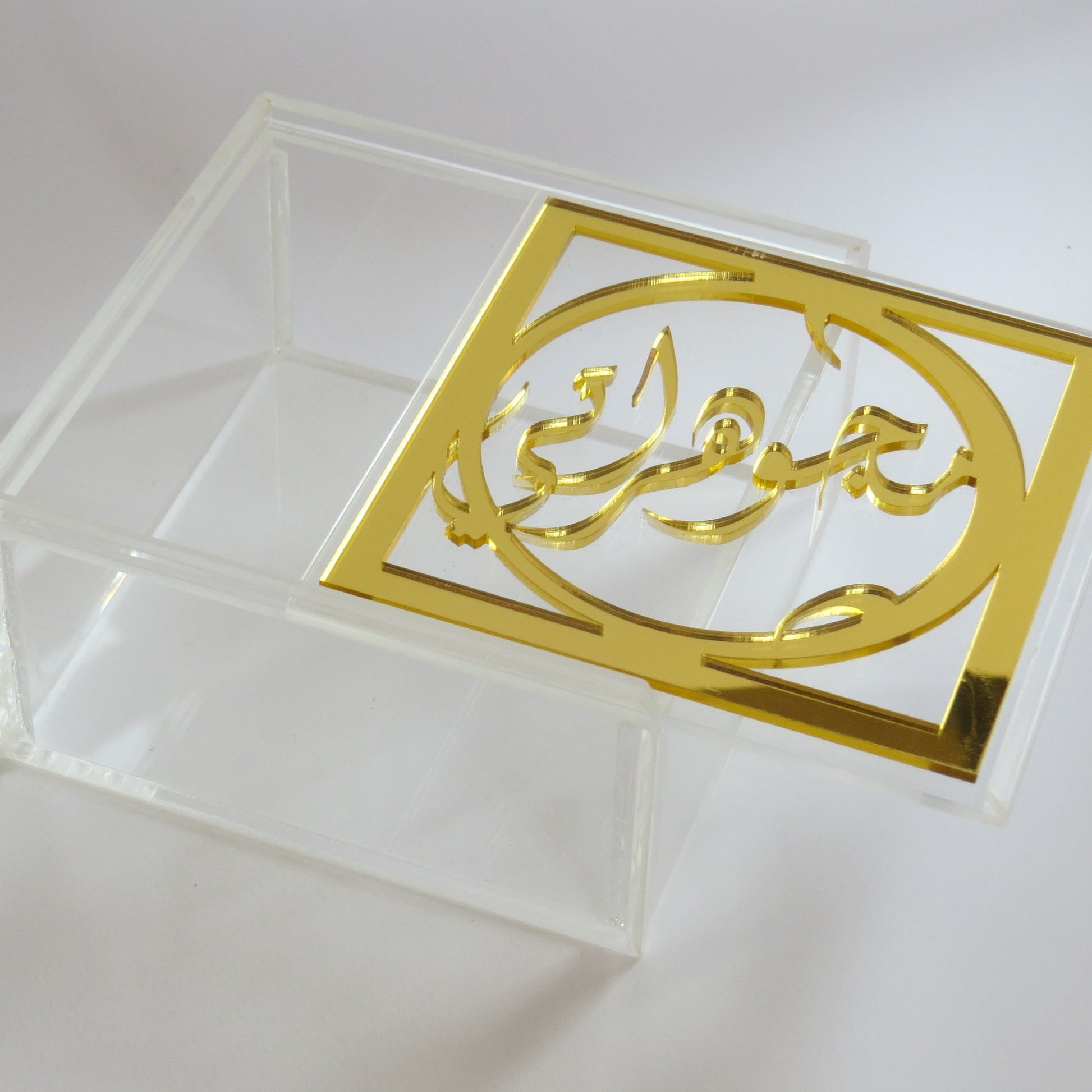 A timeless design that blends tradition with modern elegance. This clear acrylic box is beautifully topped with gold mirror Arabic calligraphy, making it a meaningful and refined piece perfect for gifts, keepsakes, or décor.