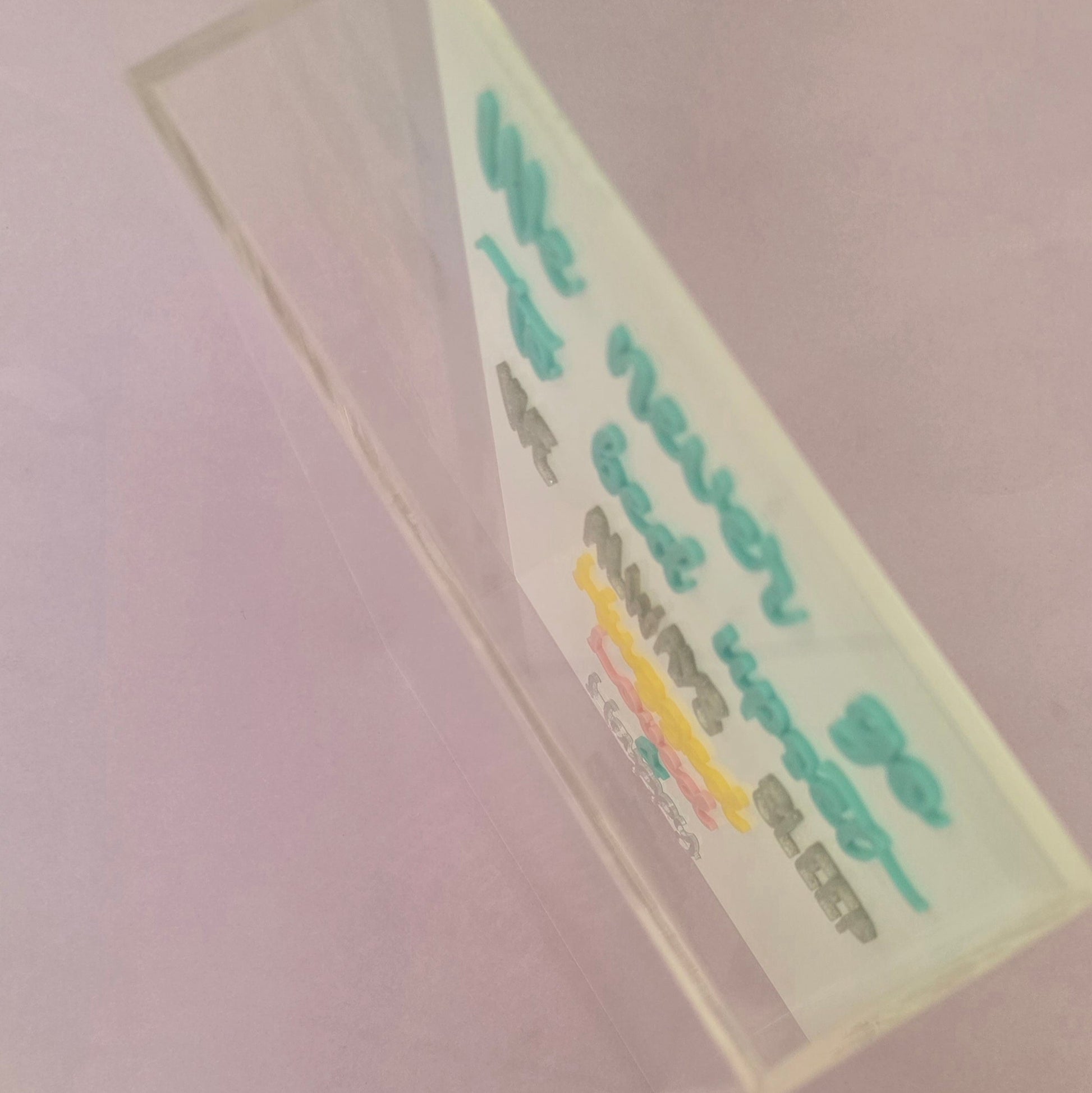 - Mirror plexiglass quote pieces in vibrant colors (teal, silver, yellow, pink, grey)