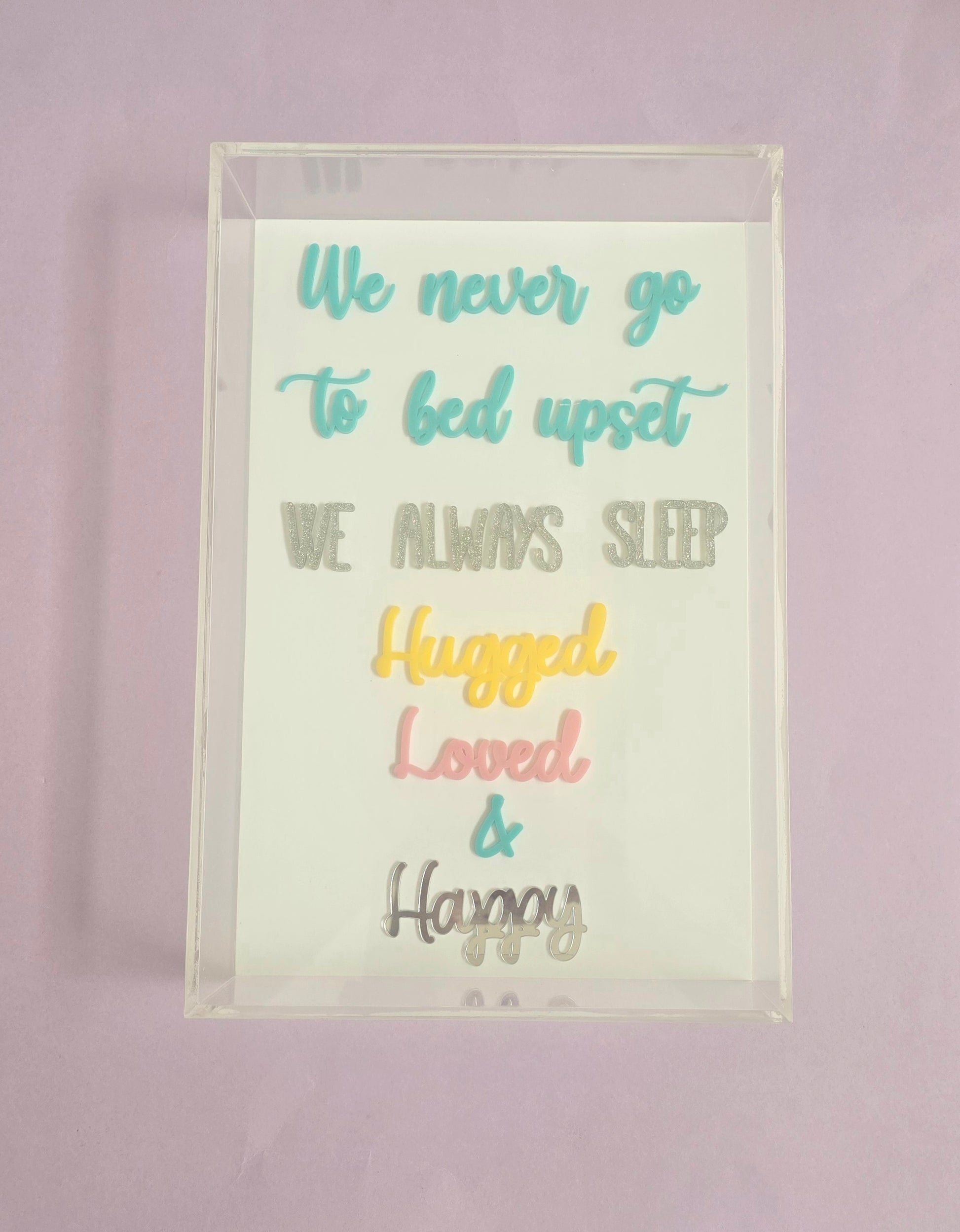 This elegant and meaningful frame box brings warmth and reassurance into any room. Featuring the comforting quote "We never go to bed upset – We always sleep hugged, loved & happy" in mirror plexiglass letters, it’s the perfect decorative reminder of love and connection.