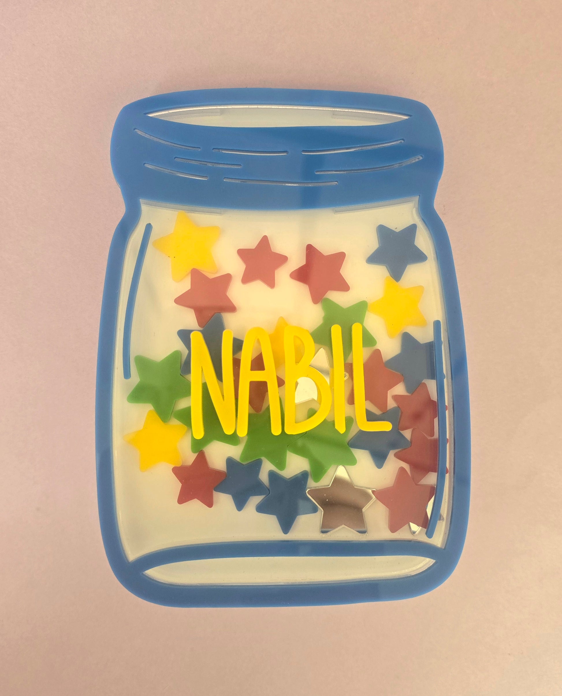 Each jar comes with a custom name in acrylic and can be decorated with your preferred theme, stars, hearts, rainbows, or simple name-only designs. It also includes a sturdy stand on the back so it can be proudly displayed on a shelf, desk, or dresser.