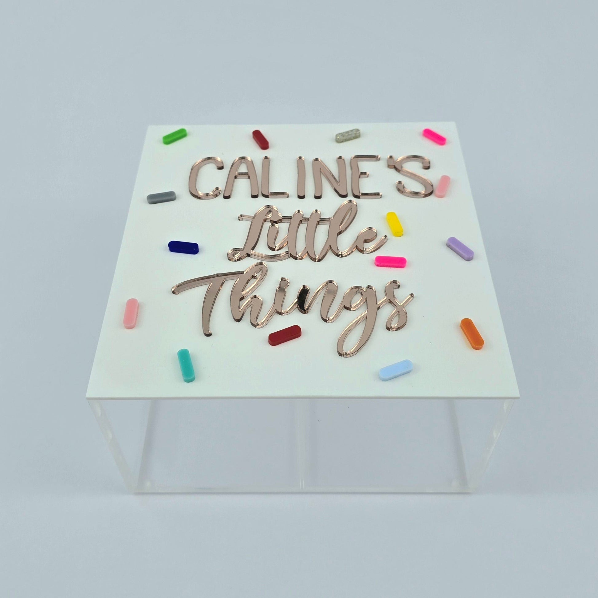 A stylish and fun way to store your little treasures! This confetti-themed storage box is designed for those who love color, sparkle, and personalization. Featuring a custom name in elegant pink gold mirror writing, surrounded by multicolored confetti sprinkles, this box is perfect for storing jewelry, accessories, keepsakes, or small treasures while adding a vibrant touch to your space.