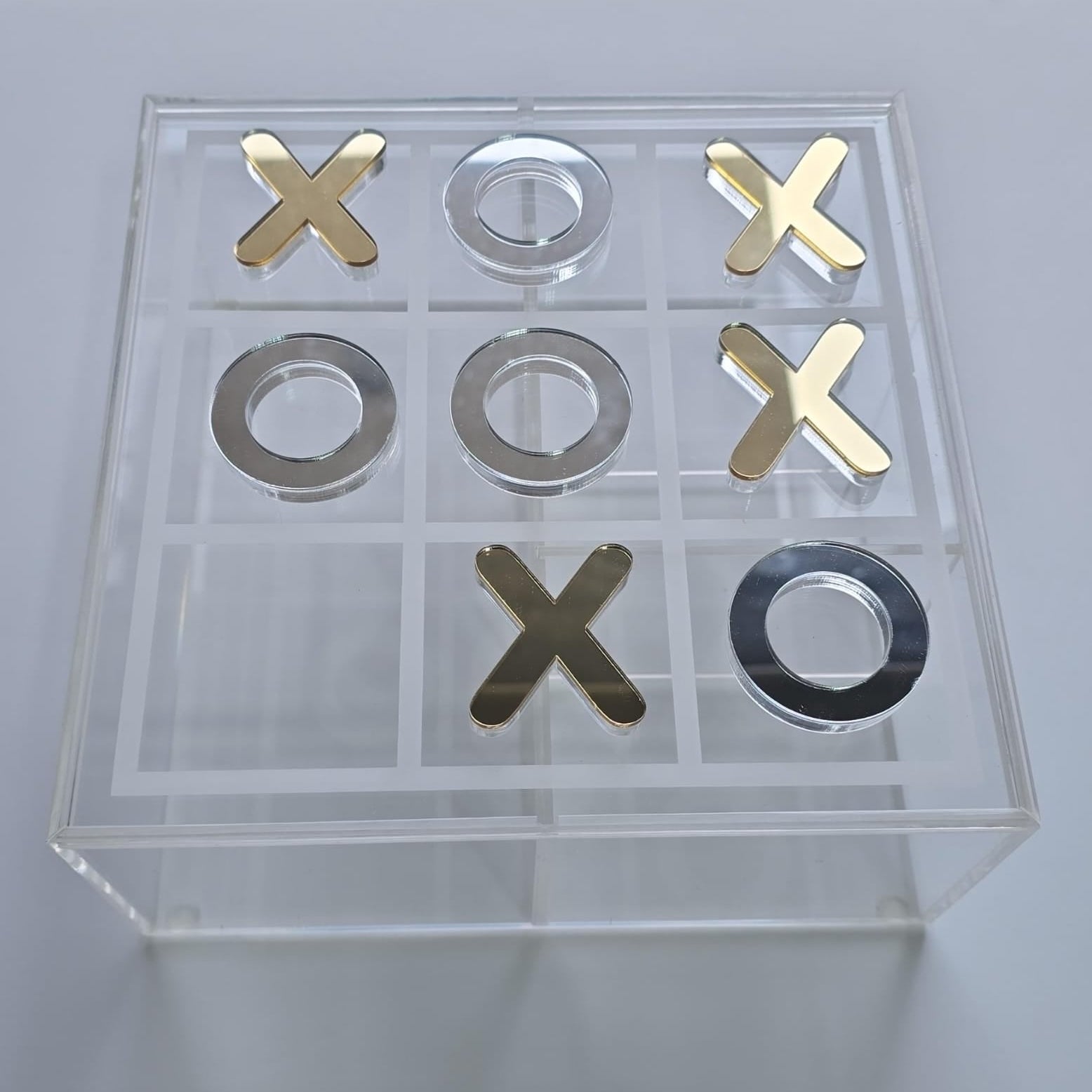 Crafted from high-quality clear acrylic, this stylish box features an engraved grid and luxurious gold and silver X & O game pieces. Whether displayed on your coffee table or used for organizing small items, it's designed to impress.